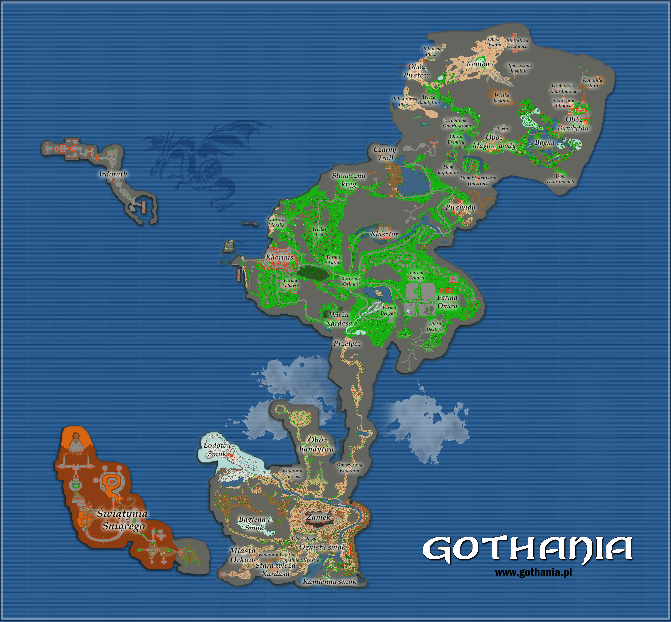 Świat Gothanii znajduje się na jednym dużym kontynencie o nazwie Khorinis oraz kilku wyspach. Kliknij na wybrany poniżej link, aby dowiedzieć się więcej o różnych lokacjach.